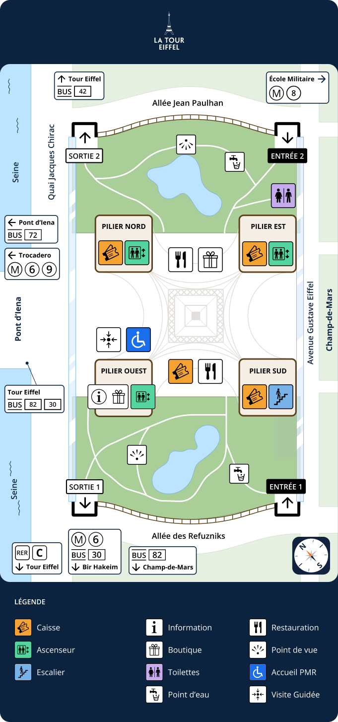 Le parvis de la tour Eiffel est le point de départ de votre visite. Vous avez une question ou un problème concernant votre visite ? Nos équipes d'accueil sont là pour vous aider et vous orienter. Trouvez informations et assistance au Point Information du Pilier Ouest. Nous invitons nos visiteurs en situation de handicap et leurs accompagnants à se signaler auprès de nos équipes d'accueil dès qu'ils arrivent sur le parvis.